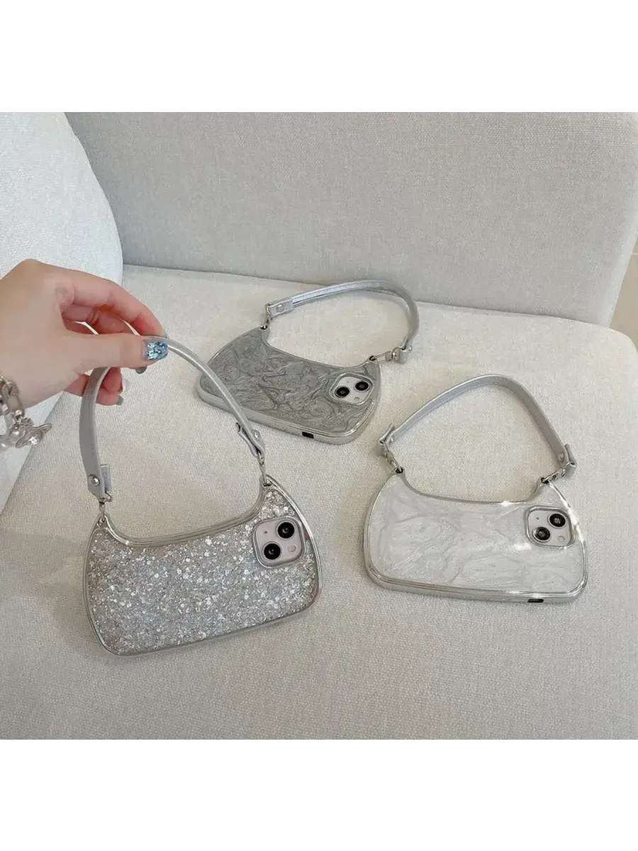 Гальванический чехол для iPhone 16 серебристого цвета с блестками и коротким ремешком на руку. Такой чехол-сумочка не только удобен и практичен, но и стильно смотрится и подходит к любому модному образу. А лаконичный и удобный дизайн чехла способствует быстрому доступу к экрану телефона, без лишней траты времени на то, чтобы его доставать из сумки.